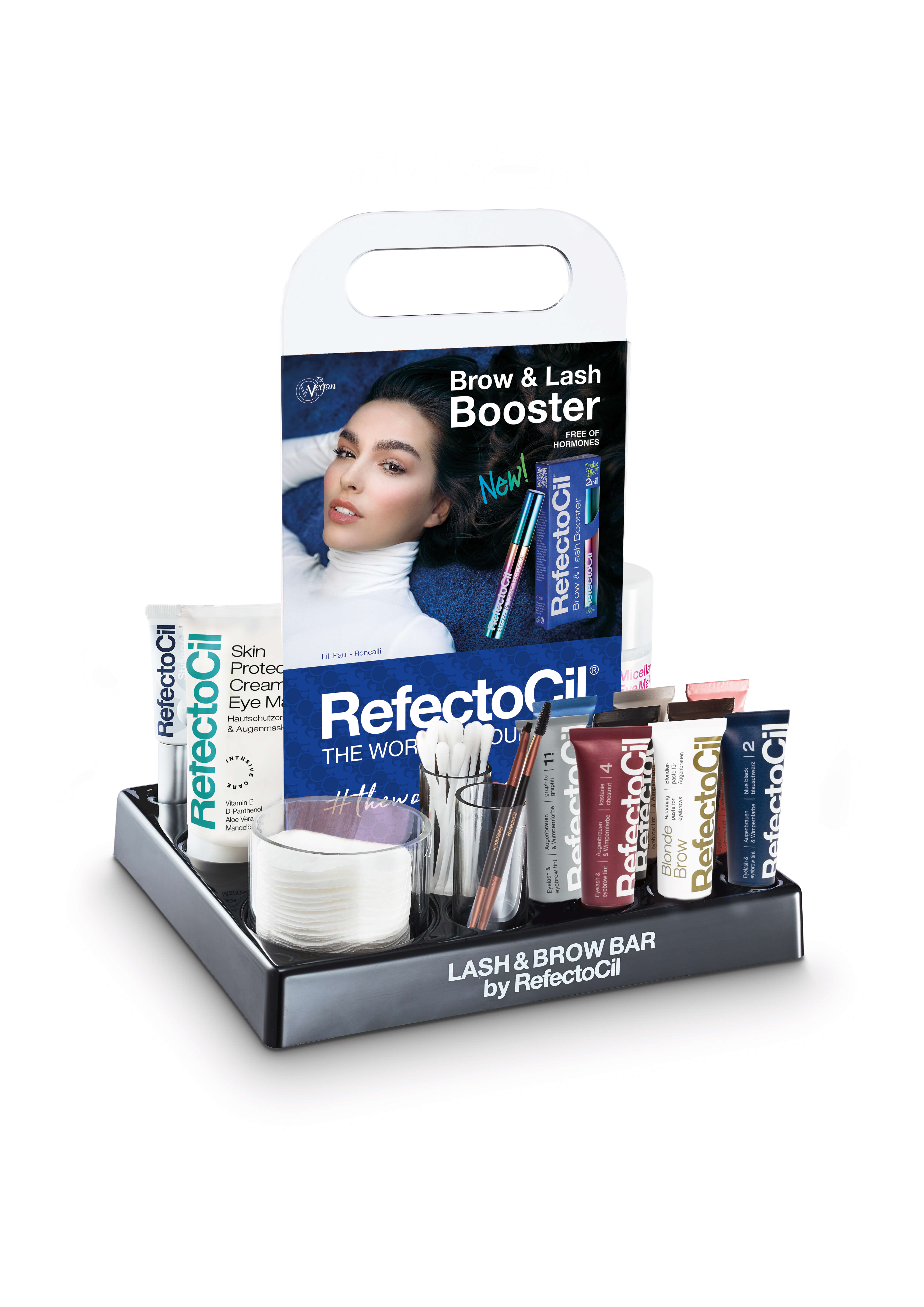 Enthalten sind alle acht RefectoCil Farben, Blonde Brow, der wimpernstärkende, ölfreie Micellar Eye Make-up Remover und alle übrigen Accessoires, die zum Färben benötigt werden. Die Behälter für Farben und Zubehör sind intergiert.