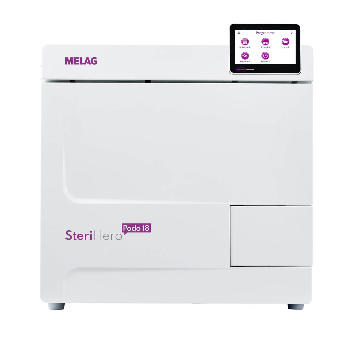 Der MELAG Autoklav SteriHero Podo 18 ist ein zuverlässiger Dampfsterilisator der Klasse B, der auch optimal auf die Anforderungen von Podologie- und Kosmetikstudios abgestimmt ist. Mit seinem großzügigen 18-Liter-Kammervolumen ermöglicht er die sichere und normgerechte Aufbereitung von Instrumenten wie Fräsern, Zangen, Sonden oder Hohlkörperinstrumenten – sowohl verpackt als auch unverpackt.