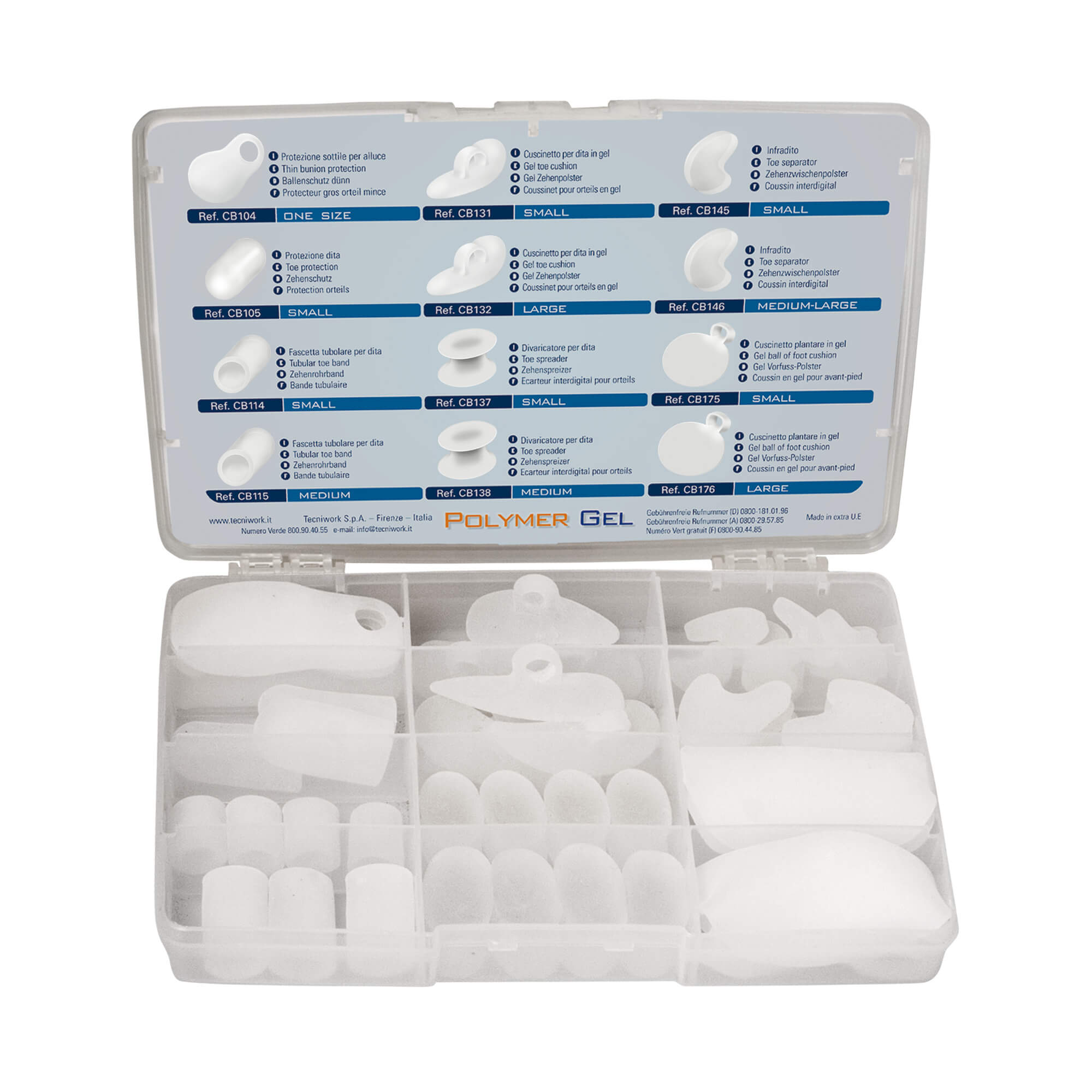 - 4 Stück dünner Ballenschutz, 4 Stück Zehenhaube - Größe S, 4 Stück Zehenring - Größe S, 4 Stück Zehenring - Größe M, 2 Paar Hammerzehenpolster - Größe S, 2 Paar Hammerzehenpolster - Größe L, 4 Stück Zehen-Spreizer - Größe S, 4 Stück Zehen-Spreizer - Größe M, 8 Stück Zehentrenner - Größe S, 8 Stück Zehentrenner - Größe M, 2 Stück Vorfusskissen - Größe S, 2 Stück Vorfusskissen - Größe L